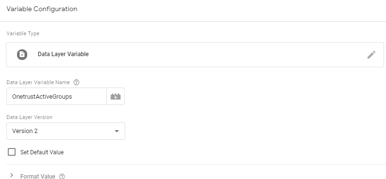 - Set the Data Layer Variable Name to OnetrustActiveGroups.