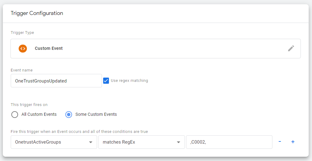 - Set the Event name to the event the on which affected tag will fire. This differs from the Data Layer variable OneTrustActiveGroups that must trigger on the event OneTrustGroupsUpdated.Select the relevant trigger and set it to fire when the following is true: